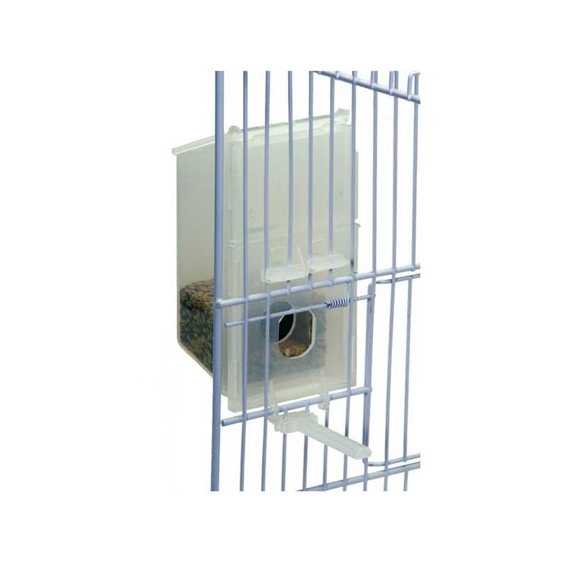 Cette mangeoire extérieure peut s'installer à la place des mangeoires traditionnelles ou s'accrocher à une porte coulissante de la cage. Le remplissage des graines se fait très facilement grâce au couvercle sur le dessus.