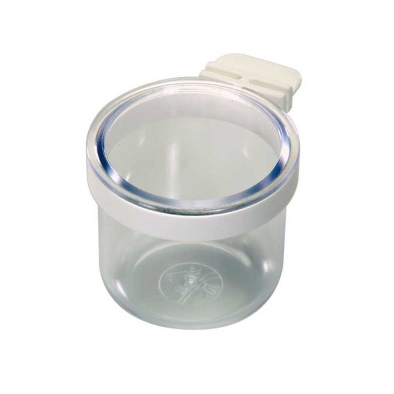 Godet à pâtée avec système d'attache indépendant adapté aux barreaux de cage verticaux. Pratique pour remplir le godet. Système d'attache vert, jaune ou blanc selon le stock.